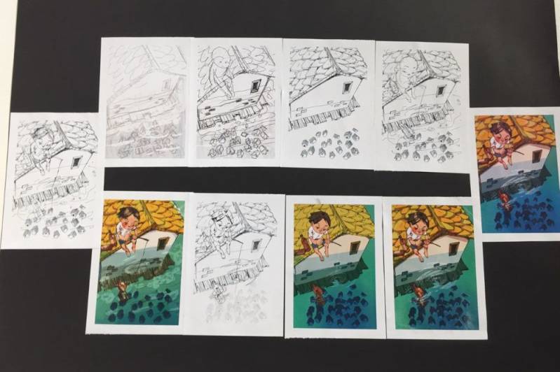Wat te zien is in de tekening is een jongetje op een drijvend huis, die met een hengel het gezonken dorp probeert te bereiken zonder enig succes. In de tekening zijn vooral blauwe en rode tinten gebruikt die in contrasten tegenover elkaar staan. Het werk staat op A3 en is digitaal getekend voor een nette afwerking.
